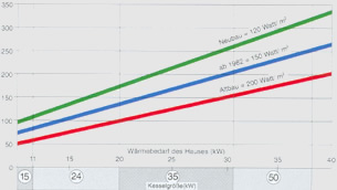 Während dieser Fehlzeiten übernimmt ein Pufferspeicher die Wärmever-sorgung des Hauses. Der Pufferspeicher muß aber stets nachgeladen werden, wenn der Holzkessel brennt. Der Holzkessel muß dann zusätzlich zum Wärmebedarf des Hauses den Pufferspeicher wieder aufladen. Der Kessel soll also 30-50 % größer als der Wärmebedarf des Hauses ausgelegt werden. Nebenstehendes Diagramm zeigt unverbindliche Richtwerte für Einzelhäuser mit ca. 2,5 m Raumhöhe.
